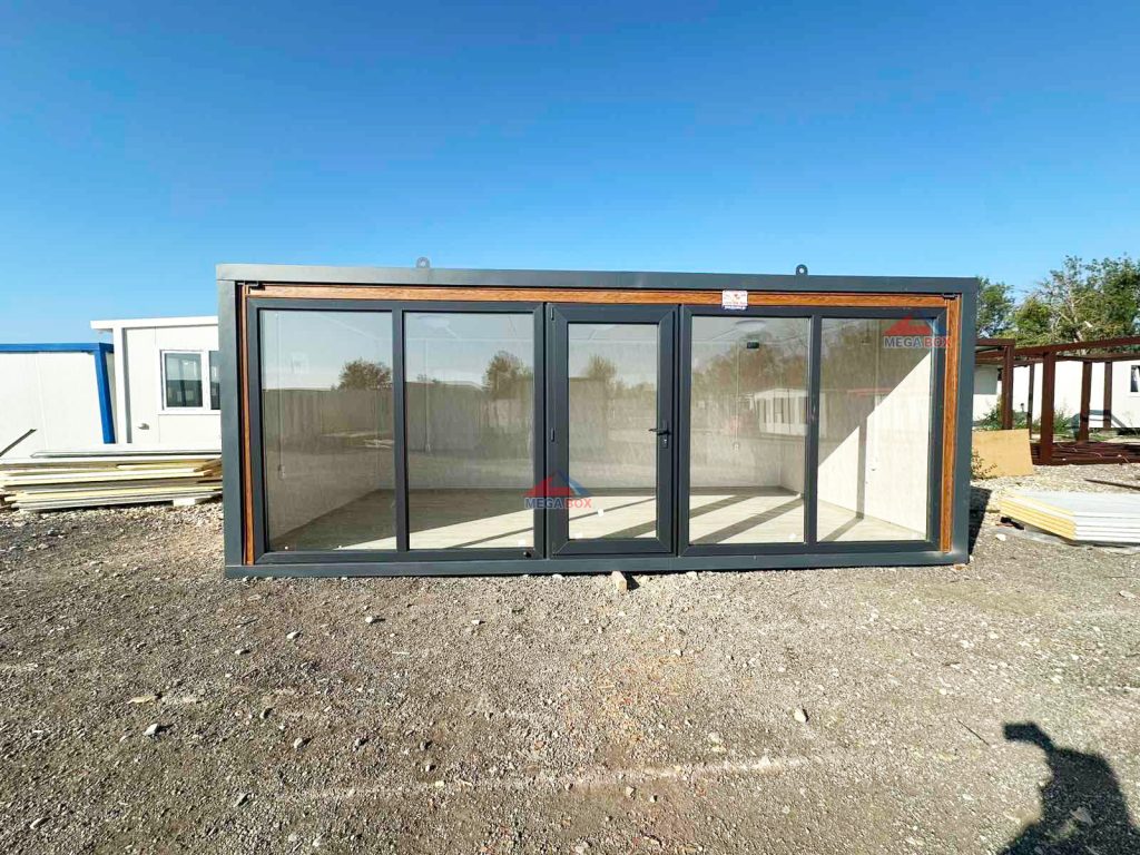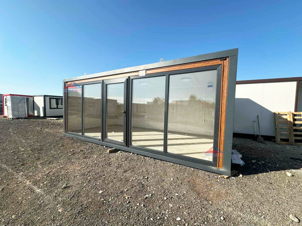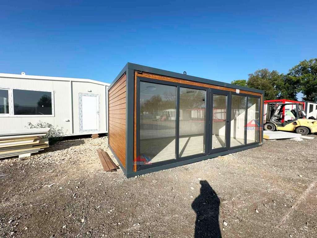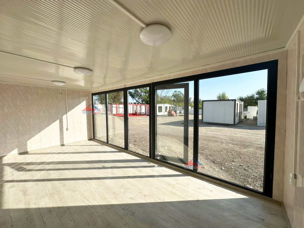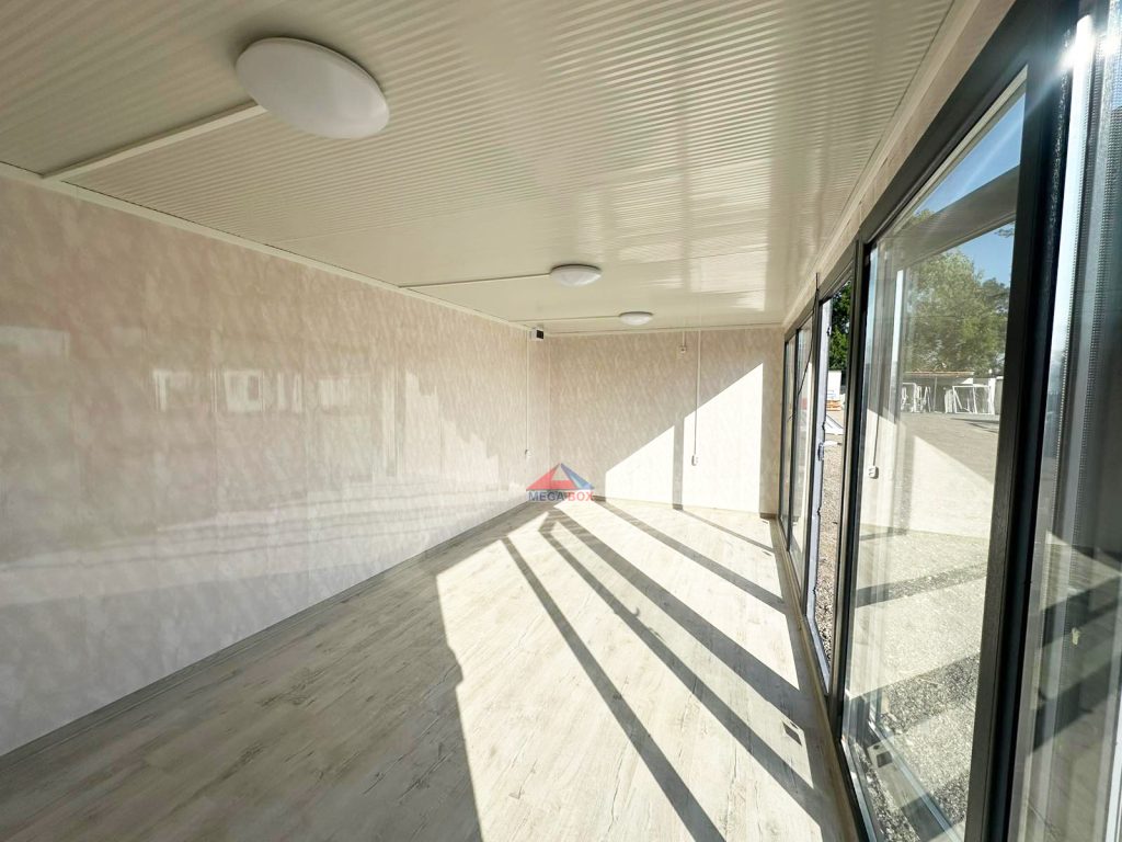 Външни стени: сандвич панел 40мм полиуретанова пяна + облицовка сайдинг „Golden Oak” Вътрешни стени: сандвич панел 40мм + облицовка PVC ламперия Marmmino Beige